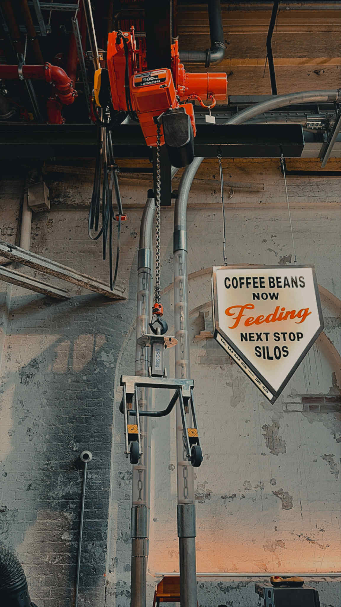 かつて機関車の整備に使われていた建物をリノベーションしており、店内にはパイプや焙煎機が並ぶインダストリアルな雰囲気が広がっています。